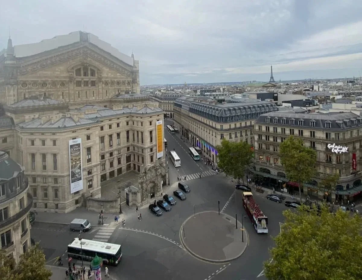 ギャラリー・ラファイエットのテラス席から見たパリの街並みとエッフェル塔