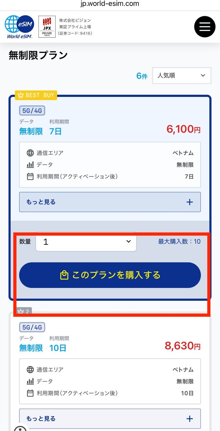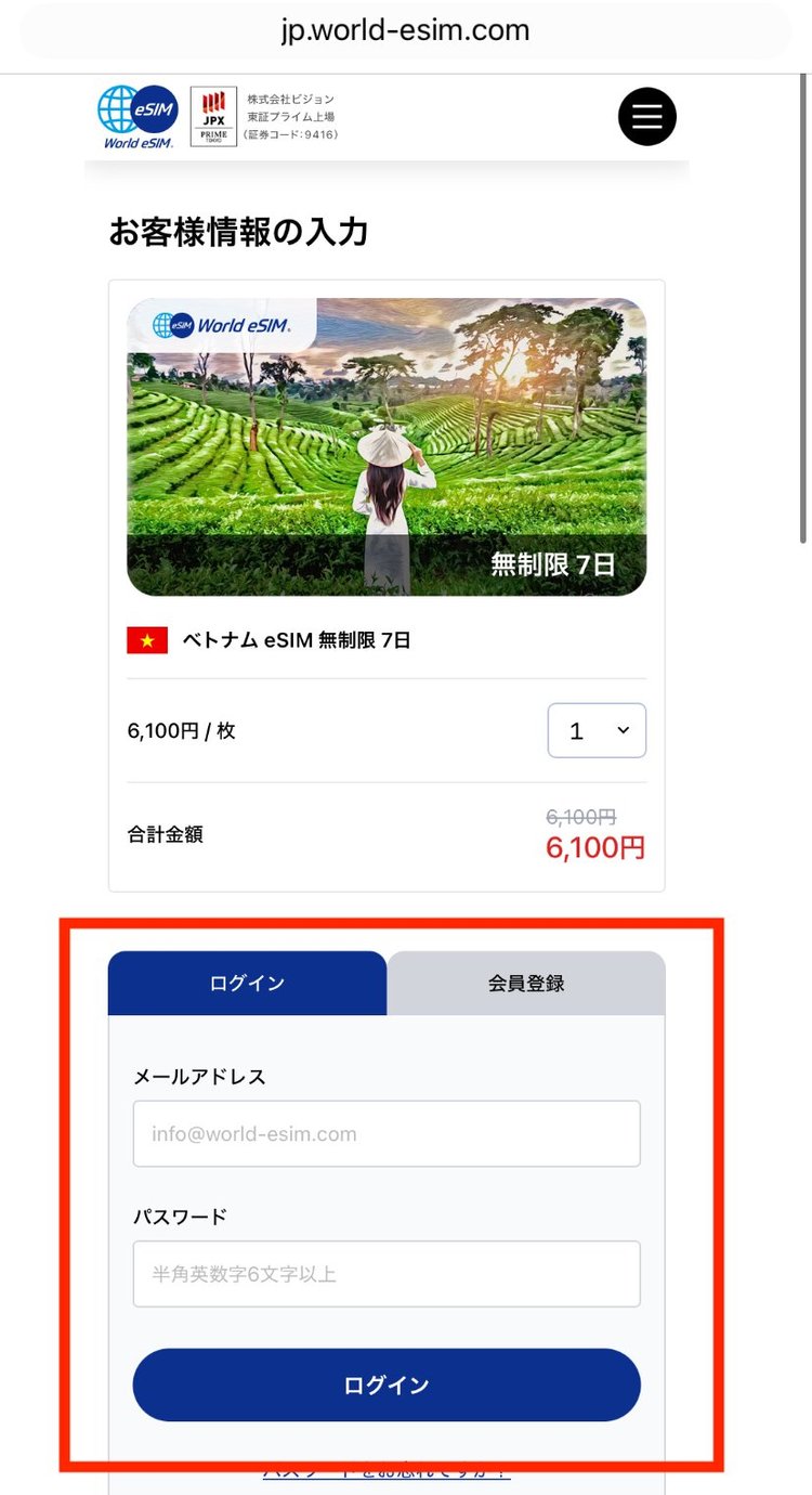 選択したプラン(例:ベトナム 無制限データ 7日間)が表示されます。ログインするか、新規の場合は会員登録を行います。