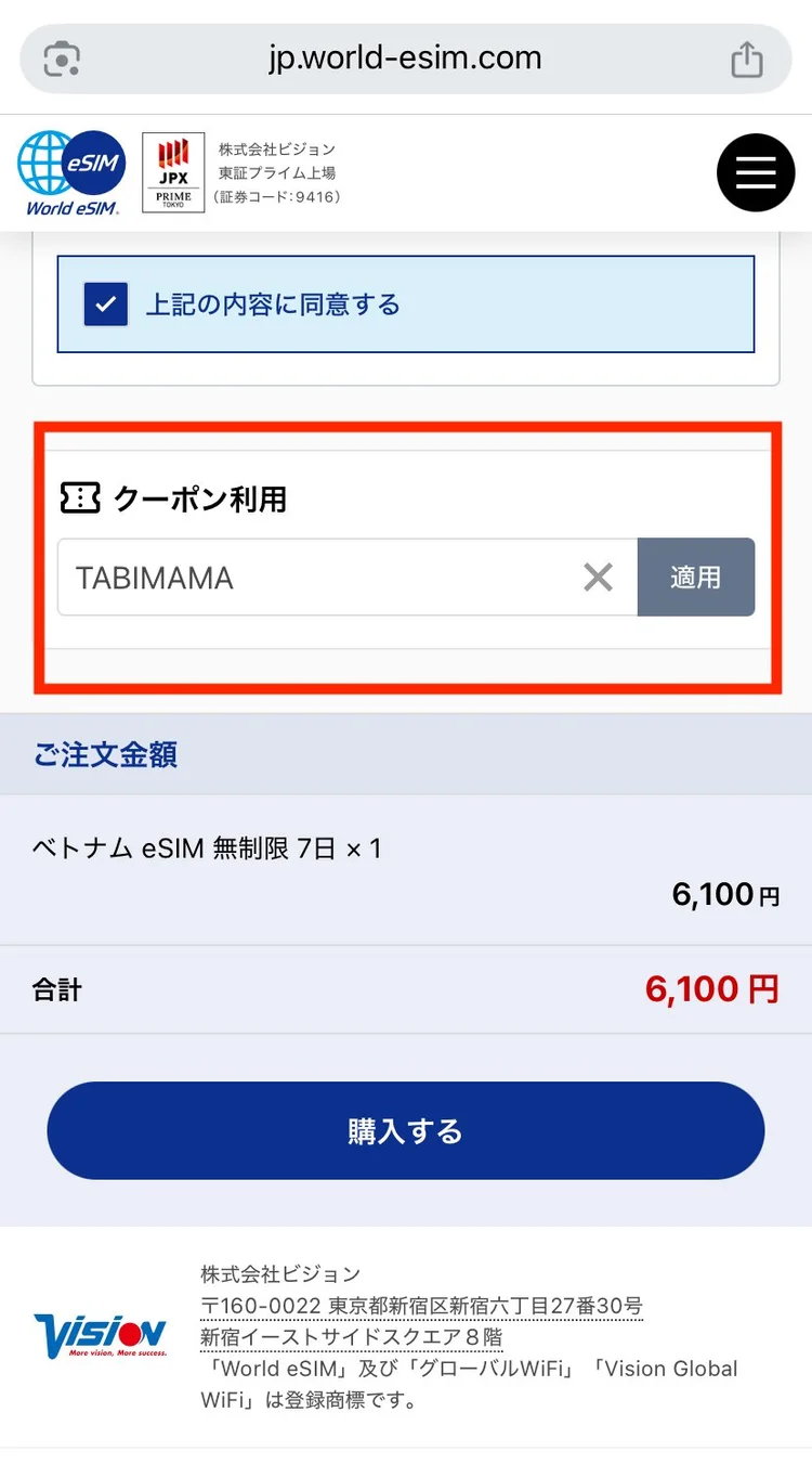 クーポン利用欄に「TABIMAMA」と入力し、「適用」をタップします。