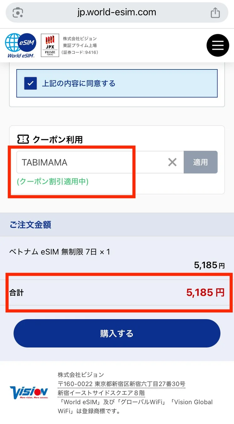 アプリ経由(10%割引)よりも、World eSIM公式サイトで「TABIMAMA」を入力する方が断然お得。