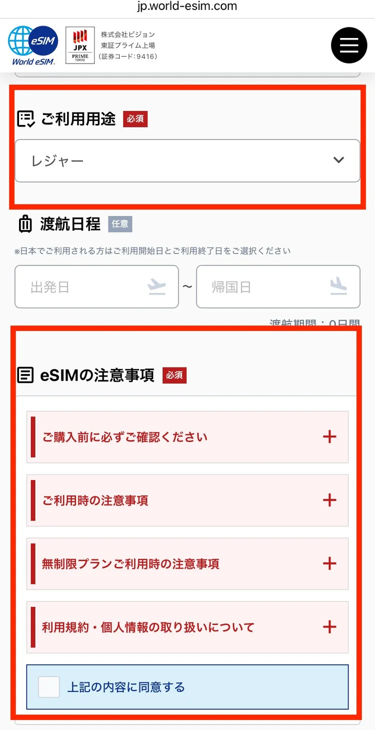 eSIMの注意事項を確認し、「上記の内容に同意する」にチェックを入れます。